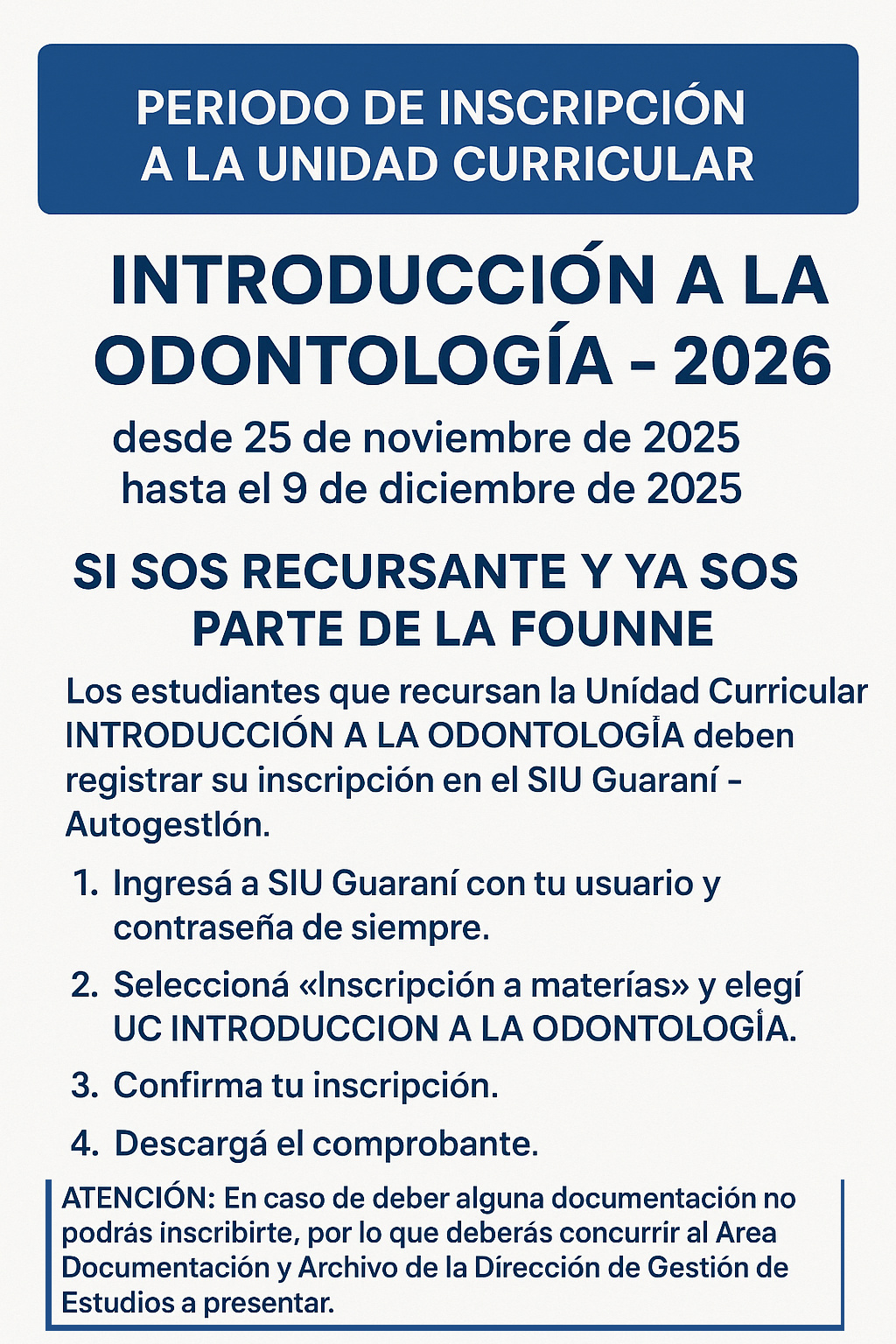 Posted on 7 de noviembre de 2025 in Avisos Introducción a la Odontología Periodos de Inscripción a Aspirantes Re cursantes a la Unidad Curricular Introducción a la odontología Aña 2026. Ingresantes Recursantes – Video de paso a Paso para Aspirante a Ingreso.